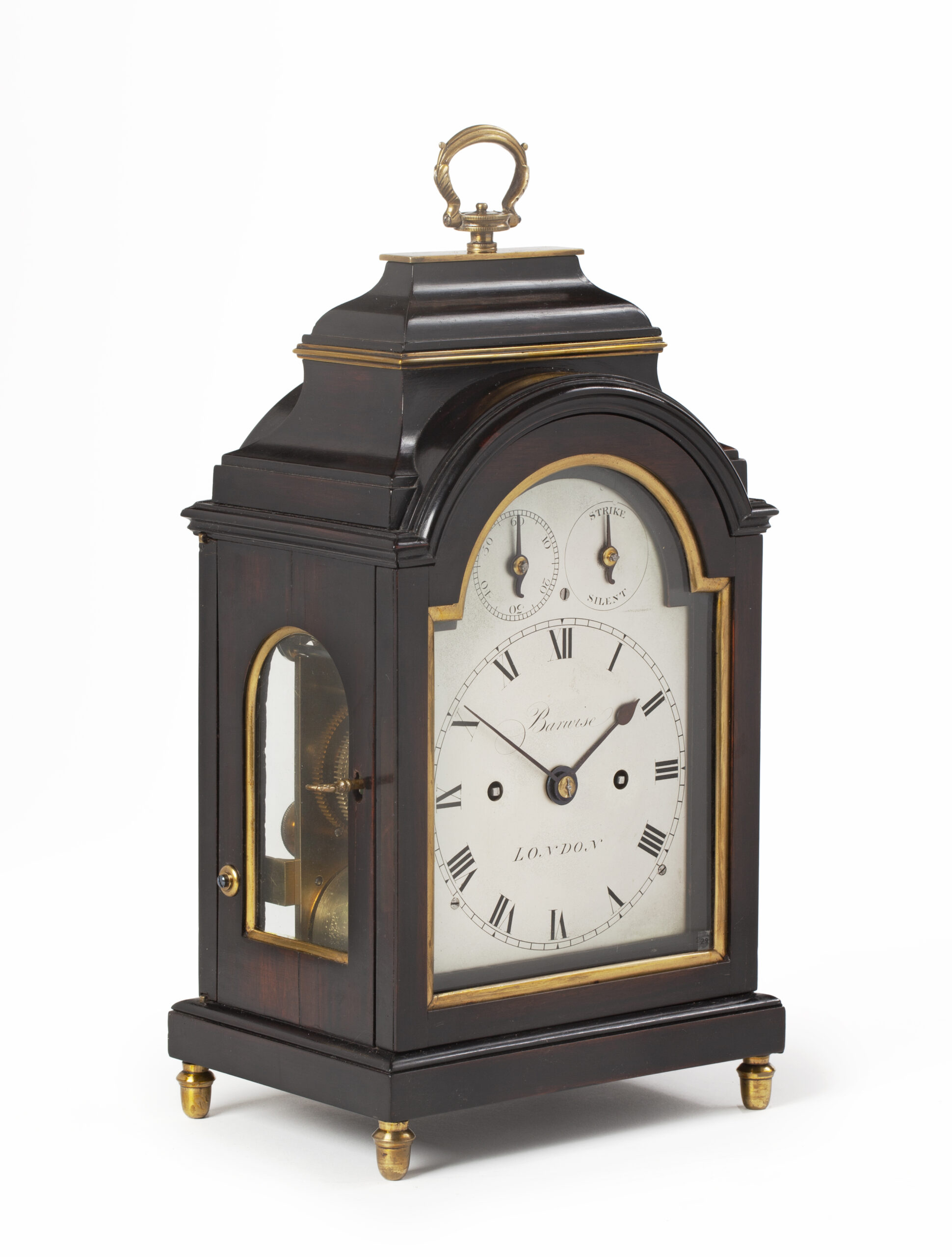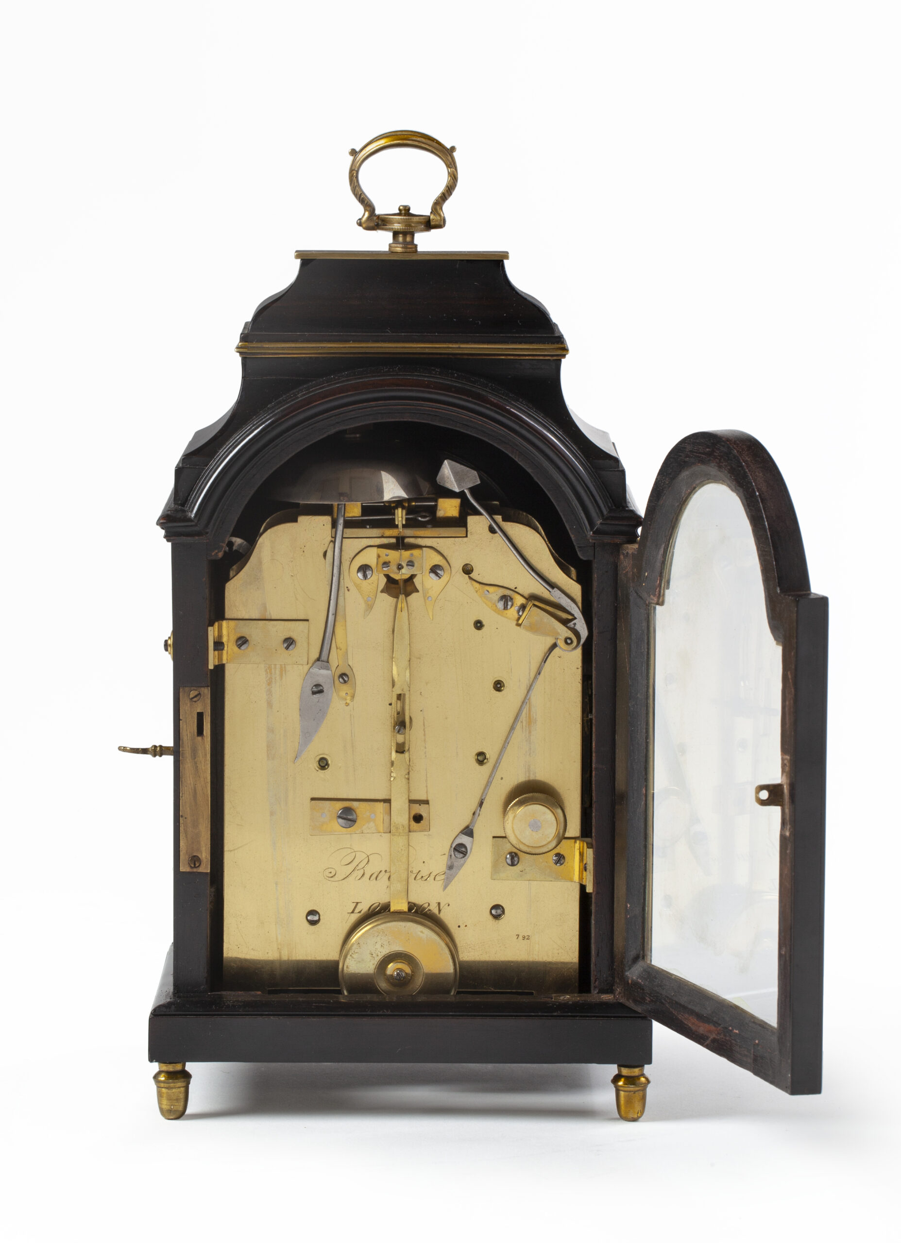 Het huidige uurwerk van deze kleine tafelklok is verfijnd afgewerkt en van zeer aangename proporties. De ebbenhout gefineerde kast met geprofileerde ‘bel-top’, wordt bekroond door een sierlijk messing handvat. Het geheel rust op vier messing pootjes.