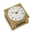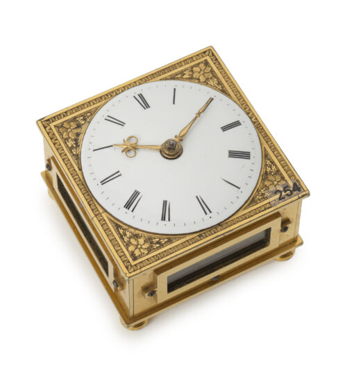 De tischuhr heeft een vierkante kast en is vervaardigd van verguld messing en heeft vier raampjes met rechthoekige, messing vergulde monturen. In de vier hoeken naast de wijzerplaat zijn gegraveerde bloemen met bladmotieven aangebracht. Het geheel wordt omrand door een gegraveerd kader. In de bodemplaat van de tischuhr bevindt zich het opwindgat voor het gaandwerk dat is voorzien van een shutter. Daarnaast wordt de bodem geopend door middel van een hendeltje. Het klokje staat op vier messing vergulde pootjes.
